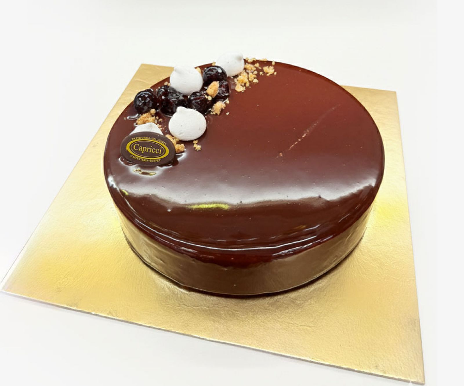 Cake cioccolato fondente, bavarese cioccolato fondente al 66% con cremoso al mascarpone, composta di lampone amarena, e glassa fondente